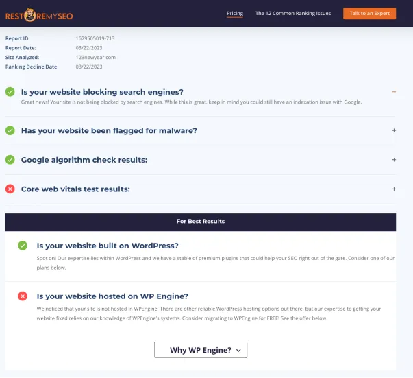 Our Quick Scan technology will do an initial audit of your website and look for 4 of the 12 Ranking Issues, including Search Engine Blocks, Malware, Core Web Vitals and Google Algorithm Penalties. We then offer a plan to fix your issues as a one-time project, or with ongoing efforts to help reverse course. All plans include a full audit where we look at all 12 Ranking Issues.